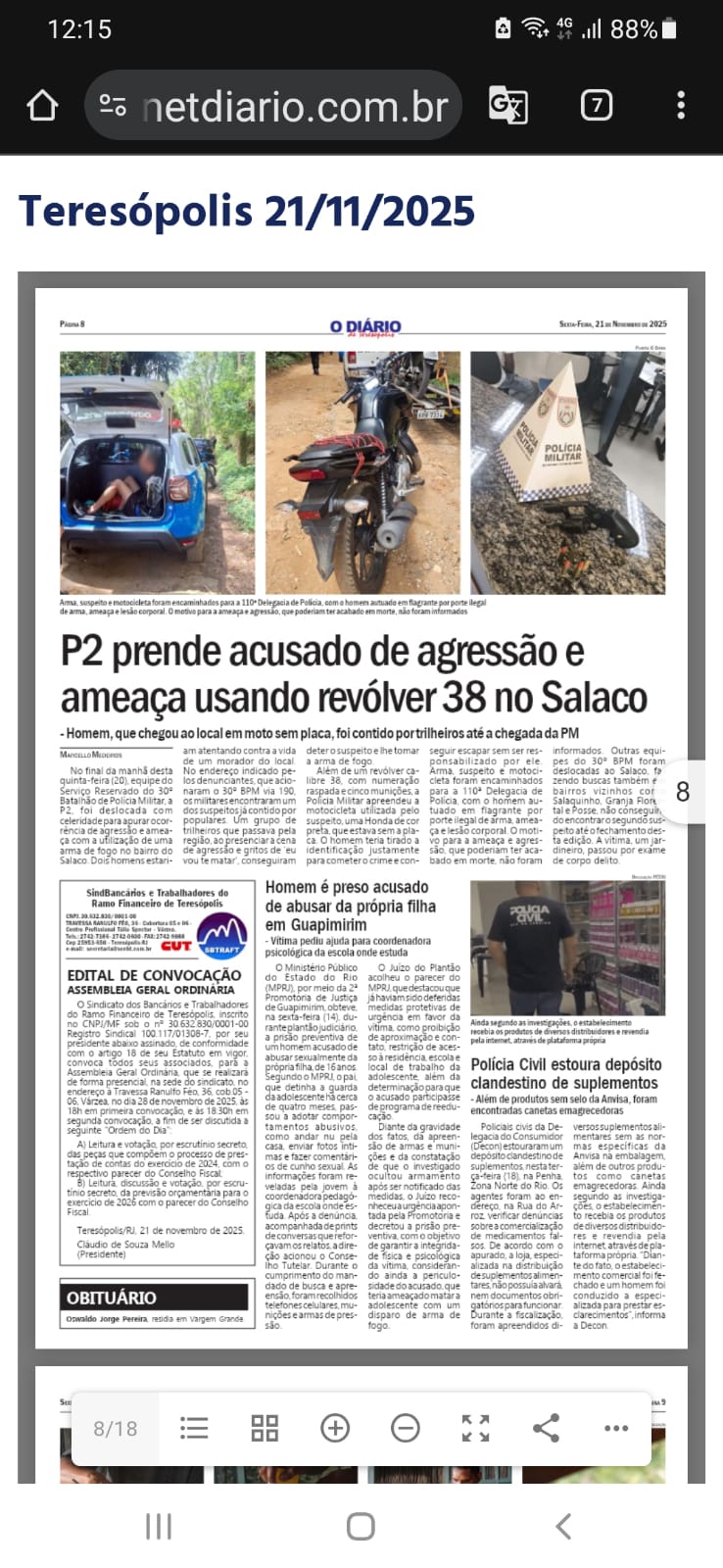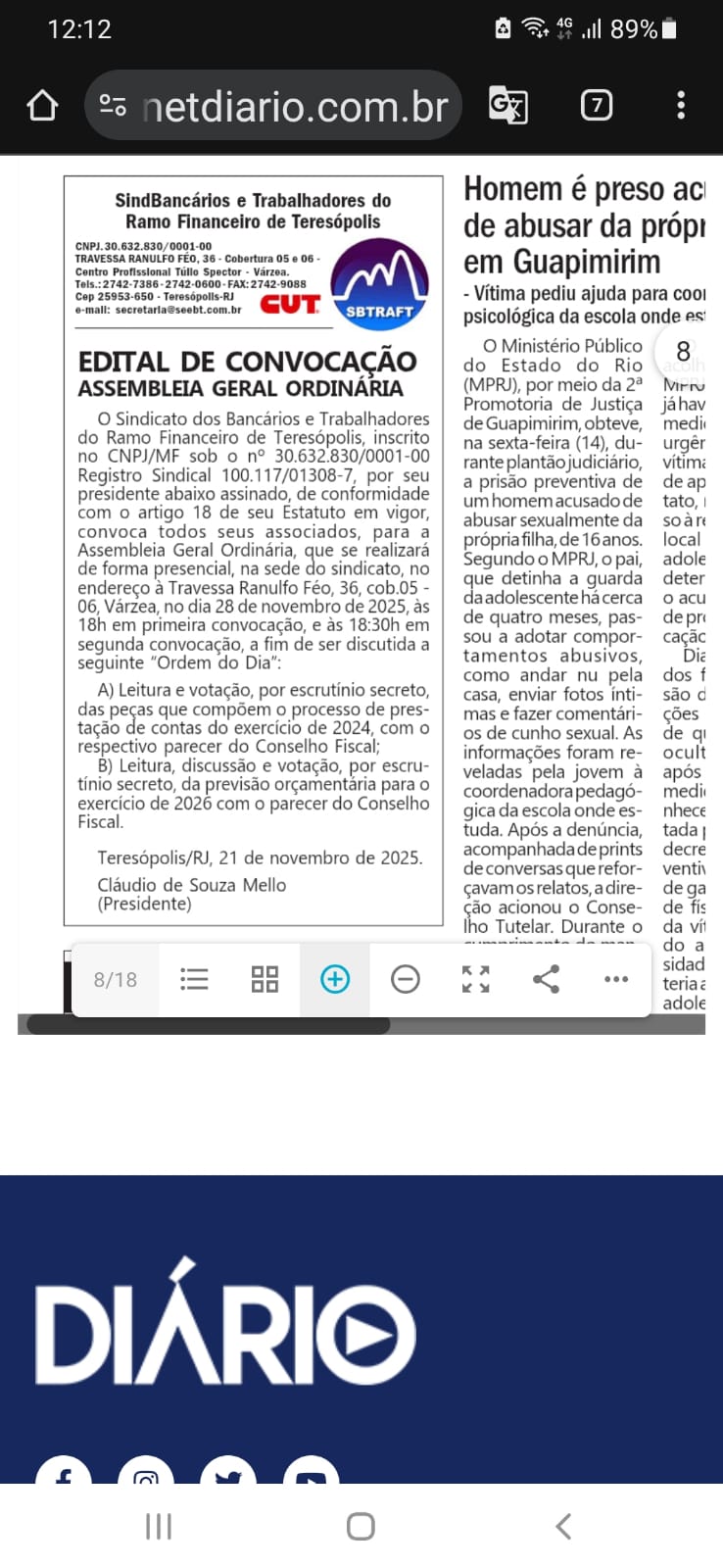 O Sindicato dos Bancários e Trabalhadores do Ramo Financeiro de Teresópolis, inscrito no CNPJ/MF sob o nº 30.632.830/0001-00 Registro Sindical 100.117/01308-7, por seu presidente abaixo assinado, de conformidade com o artigo 18 de seu Estatuto em vigor, convoca todos seus associados, para a Assembleia Geral Ordinária, que se realizará de forma presencial, na sede do sindicato, no endereço à Travessa Ranulfo Féo, 36, cob.05 – 06, Várzea, no dia 28 de novembro de 2025, às 18h em primeira convocação, e às 18:30h em segunda convocação, a fim de ser discutida a seguinte “Ordem do Dia”: