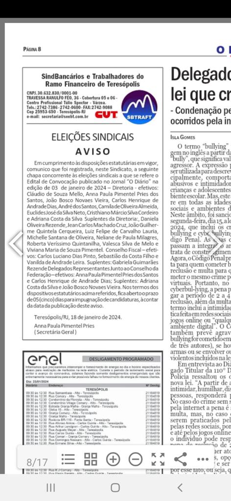 CHAPA ÚNICA CUTISTA NAS ELEIÇÕES 2024 DO SINDBANCÁRIOS DE TERESÓPOLIS.