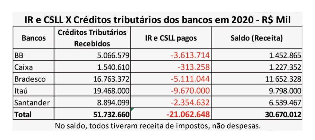 Mario explicou que os bancos não emprestam dinheiro nos momentos de crise para evitar prejuízos com calotes de pessoas e empresas, mas quando têm “prejuízos” conseguem recuperar o dinheiro com “créditos tributários”, que em 2020 superou em valor o que eles deveriam pagar.