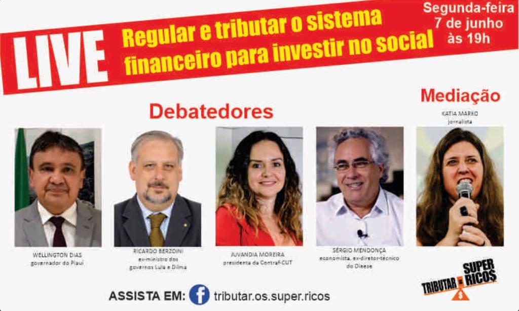 O governador do Piauí, Wellington Dias, o ex-ministro, Ricardo Berzoini, o economista e ex-diretor-técnico do Departamento Intersindical de Estatística e Estudos Socioeconômicos (Dieese), Sergio Mendonça, e a presidenta da Confederação Nacional dos Trabalhadores do Ramo Financeiro (Contraf-CUT), Juvandia Moreira, vão debater, nesta segunda-feira (7), a partir das 19h, sobre o sistema financeiro brasileiro, os tributos que incidem sobre o setor, um dos que mais lucram no Brasil, e de que forma tais tributos podem contribuir para o aumento dos investimentos sociais no país.